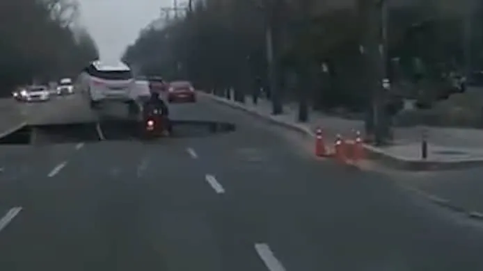 dat voor verkeerschaos zorgt. Daarbij verdwijnt één man in het gat. Hij overleeft het ongeluk niet. Bovenstaande beelden laten weinig aan de verbeelding over. Een dashcam filmt hoe plots op enkele meters afstand een gat verschijnt van maar liefst 20 meter breed. Een rijdende auto ontsnapt nog net aan het ergste en gaat even de lucht in, maar een aankomende motorrijder verdwijnt in het twintig meter diepe zinkgat. De vrouw in de auto raakt lichtgewond door de klap, maar van de motorrijder ontbreekt elk spoor. (HLN)