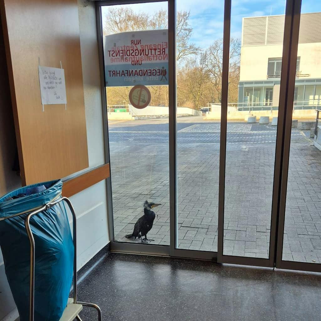 DUISTLAND - Een gewonde aalscholver heeft geprobeerd hulp te krijgen door op de deur van de spoedeisende hulp van een Duits ziekenhuis te pikken.