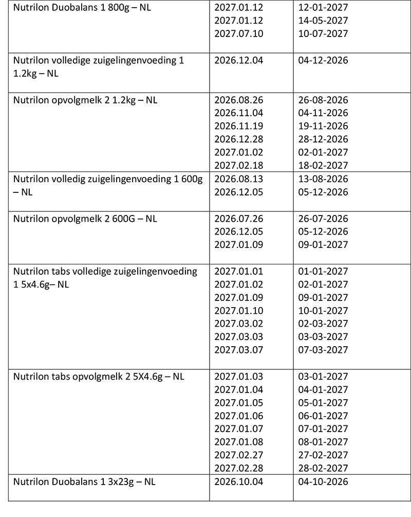 De bevoegde Surinaamse autoriteiten hebben direct gehandeld, beschikken over inzicht in de betreffende batches en monitoren de situatie actief in samenwerking met de relevante instanties. Er zijn op dit moment geen meldingen van gezondheidsproblemen in Suriname. De genomen maatregelen zijn uitsluitend uit voorzorg, in het belang van de gezondheid en veiligheid van zuigelingen en jonge kinderen.